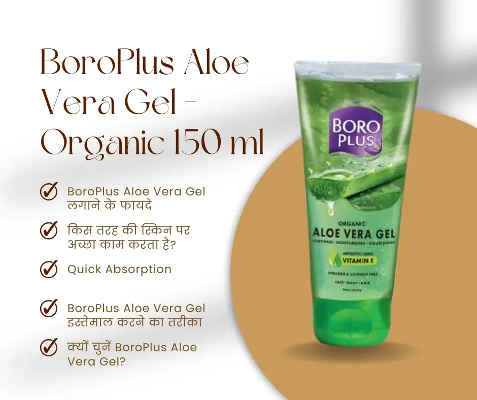 सबसे पहले, थोड़ा इस प्रोडक्ट के बारे में जान लो। BoroPlus एक ट्रस्टेड इंडियन ब्रांड है, और ये उनका 100% ऑर्गेनिक एलो वेरा जेल है, जो 150 ml की बोतल में आता है। इसमें प्योर एलो वेरा है, साथ में विटामिन E और कुछ हर्ब्स जैसे हल्दी, चंदन और केसर मिले हुए हैं। ये नॉन-स्टिकी है, मतलब लगाने के बाद चिपचिपा नहीं लगता, और स्किन में जल्दी अब्जॉर्ब हो जाता है। मैंने इसे ट्राई किया तो लगा जैसे प्रकृति का गिफ्ट है – कोई हार्श केमिकल्स नहीं, बस नेचुरल गुडनेस। अब आते हैं मुख्य पॉइंट पर: इसे लगाने से क्या फायदे हैं?